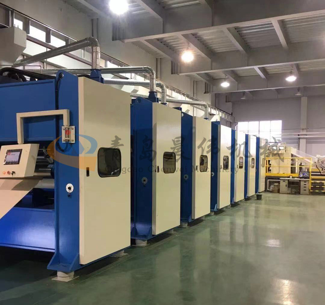 7. CWCQ-切邊成卷機(jī):設(shè)備配置3-5把切刀,可根據(jù)不同產(chǎn)品的尺寸要求將產(chǎn)品切成不同的規(guī)格長(zhǎng)度,方便靈活。采用變頻器控制調(diào)速當(dāng)棉層達(dá)到一定的規(guī)格長(zhǎng)度時(shí),數(shù)碼記數(shù)收卷,切刀自動(dòng)切斷。收卷輥由收卷電機(jī)驅(qū)動(dòng),收卷速度的控制系統(tǒng)與拉伸機(jī)的驅(qū)動(dòng)系統(tǒng)聯(lián)網(wǎng),與拉伸機(jī)同步,受張力控制器的反饋控制。展開輥使棉層展平,消除棉層在拉伸應(yīng)力作用下產(chǎn)生的一些縱向皺紋。