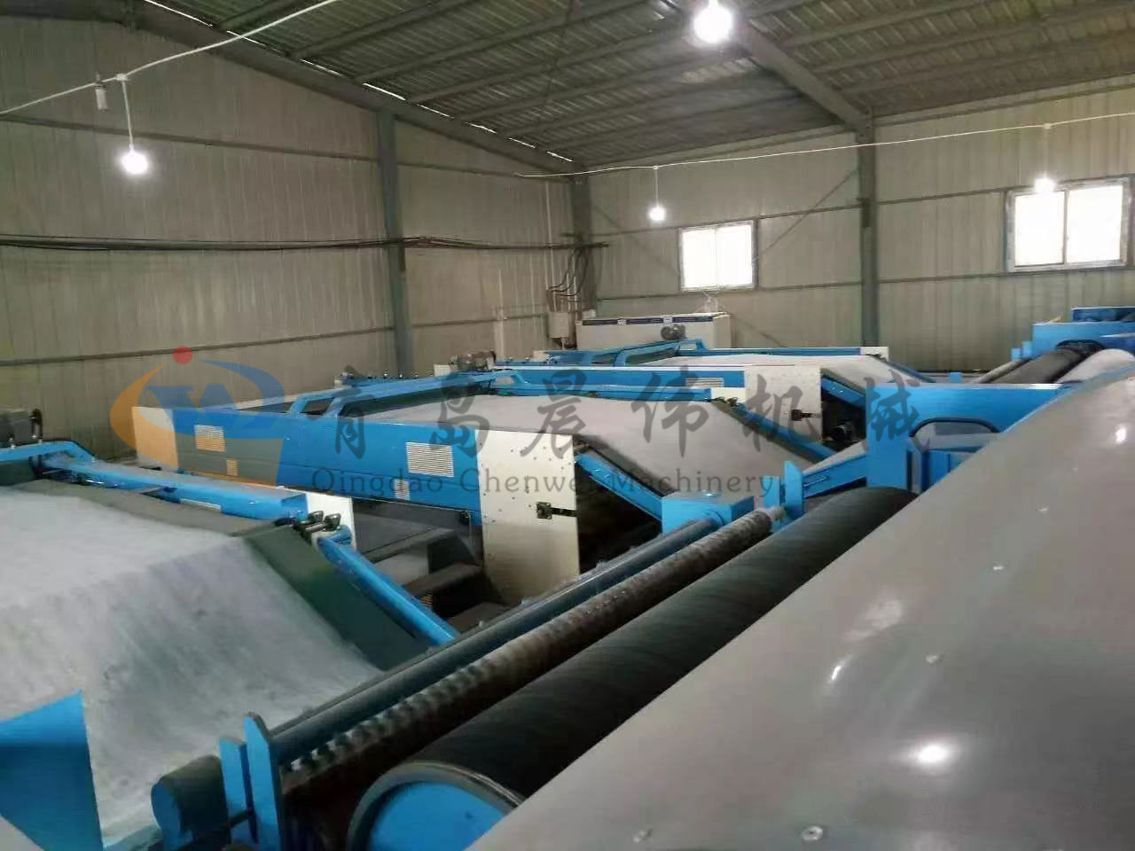 5. CWPW-鋪網(wǎng)機(jī):用于將梳理纖網(wǎng)通過移動(dòng)小車交叉折疊為所需幅寬和定量的多層纖網(wǎng),以供后道工序使用。鋪網(wǎng)輥采用特殊結(jié)構(gòu),加裝壓網(wǎng)輥和導(dǎo)流板,不飄網(wǎng)不起皺,五只大功率電機(jī)精確控制各部件的運(yùn)動(dòng),電動(dòng)輸出簾高度調(diào)節(jié)裝置